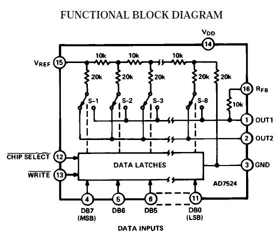The AD7524JNZ is a low cost, 8-bit monolithic CMOS DAC designed for direct interface to most microprocessors. Load cycle of the AD7524JNZ is similar to the write cycle of a random access memory. Using an advanced thin-film on CMOS fabrication process, the device provides accuracy to 1/8 LSB with a typical power dissipation of less than 10 milliwatts. The applications of the AD7524JNZ include microprocessor controlled gain circuits, microprocessor controlled attenuator circuits, microprocessor controlled function generation, precision agc circuits and bus structured instruments. Featuring operation from +5 V to +15 V, the AD7524JNZ interfaces directly to most microprocessor buses or output ports.
