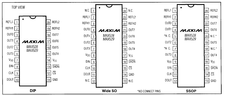 MAX528CWG features: (1)Now available in space-saving SSOP; (2)8-buffered noninverting outputs; (3)Buffer disable control; (4)2 pairs of differential reference inputs; (5)3-wire serial interface; (6)Single +5V or dual ±5V supply operation; (7)Low-power shutdown; (8)Stable driving output capacitance loads.