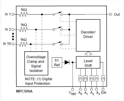 The MPC506AP is a 16-channel single-ended analog multiplexer. It has input overvoltage protection. Analog input voltages may exceed either power supply voltage without damaging the device or disturbing the signal path of other channels. The protection circuitry assures that signal fidelity is maintained even under fault conditions that would destroy other multiplexers. Analog inputs of MPC506AP can withstand 70VPP signal levels and standard ESD tests. Signal sources are protected from short circuits should multiplexer power loss occur; each input presents a 1kΩ resistance under this condition. Digital inputs of MPC506AP can also sustain continuous faults up to 4V greater than either supply voltage.