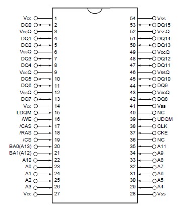 UPD45128163GA10-9JF features: (1)Fully Synchronous Dynamic RAM, with all signals referenced to a positive clock edge; (2)Pulsed interface; (3)Possible to assert random column address in every cycle; (4)Quad internal banks controlled by BA0(A13) and BA1(A12); (5)Byte control by LDQM and UDQM; (6)Programmable Wrap sequence (Sequential / Interleave); (7)Programmable burst length (1, 2, 4, 8 and full page); (8)Programmable /CAS latency (2 and 3); (9)Automatic precharge and controlled precharge; (10)CBR (Auto) refresh and self refresh; (11)x16 organization; (12)Single 3.3 V +/-0.3 V power supply; (13)LVTTL compatible inputs and outputs; (14)4,096 refresh cycles / 64 ms; (15)Burst termination by Burst stop command and Precharge command.