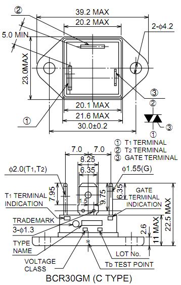 BCR30GM-12L features: (1)IT (RMS): 30A; (2)VDRM: 400V/600V; (3)IFGT, IRGT, IRGT: 50mA; (4)Viso: 2200V; (5)UL Recognized: File No. E80276.